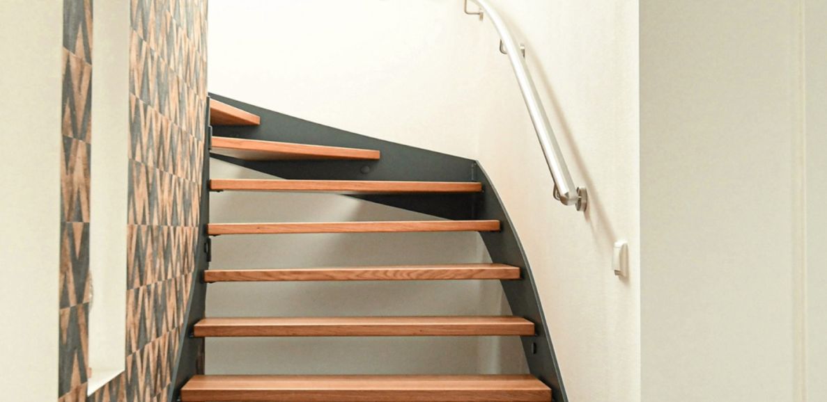 Der Massivholz-Profi stellt die Wünsche der Kunden in den Fokus und fertigt mit handwerklicher Sorgfalt und viel Liebe zum Detail Treppenunikate mit persönlicher Note. Bestes Beispiel: die halbgewendelte Stahlwangentreppe mit designstarkem Edelstahl-Wandhandlauf und Stufen aus Eiche. Weil sich die moderne Treppe passgenau an die Wände anschmiegt, wird der vorhandene Raum optimal ausgenutzt – es entsteht ein stimmiges Gesamtbild. Harmonisch ist auch das Zusammenspiel der unterschiedlichen Materialien: Die in der Trendfarbe Anthrazit pulverbeschichteten Stahlwangen bilden einen „coolen“ Kontrast zu der Schönheit und Wärme des Eichenholzes.