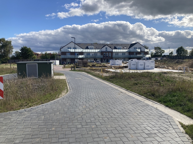 Zunächst zur Frage: Was ist passiert? Der erste Bauabschnitt mit seinen 32 Baugrundstücken ist bereits 2024 vollständig erschlossen und fertiggestellt worden. Und er hat auch Interessentinnen und Interessenten angezogen: 13 Grundstücke sind erfolgreich verkauft worden, drei Häuser sind bereits gebaut und werden von den Vorreiterinnen und Vorreitern des Gebiets bewohnt. Die nächsten Bewohnerinnen und Bewohner stehen schon vor ihren Türen, denn vier weitere Grundstücke befinden sich aktuell in Bebauung, und es ist damit zu rechnen, dass die Häuser über den Winter bezugsfertig werden.