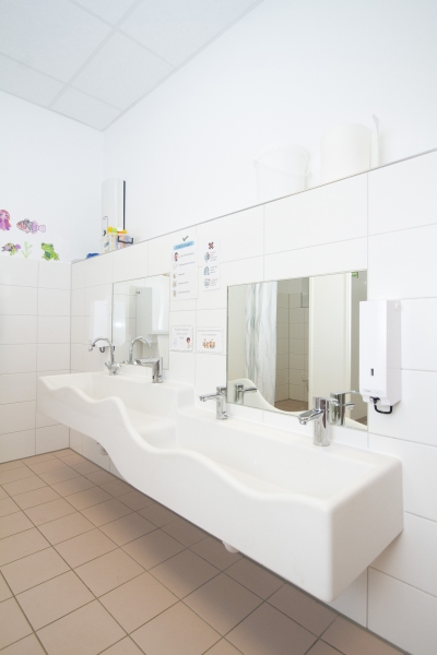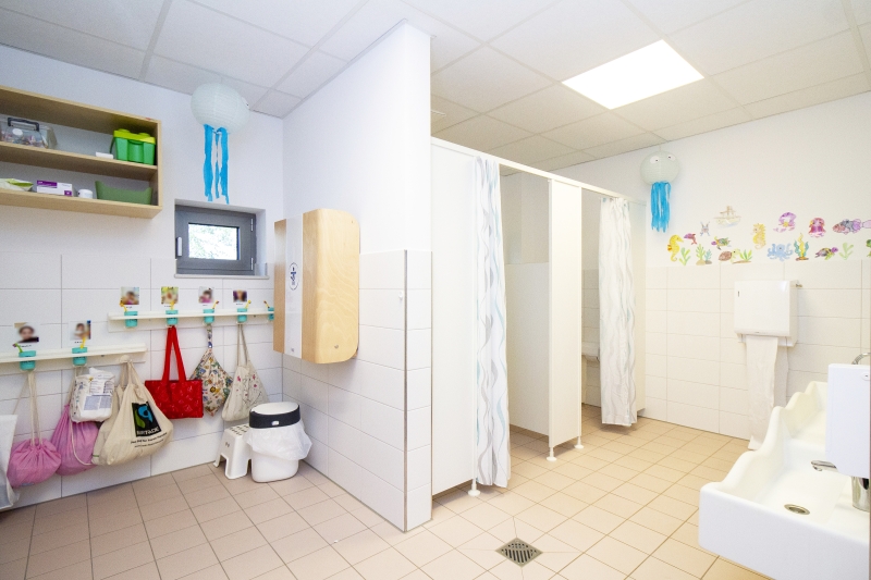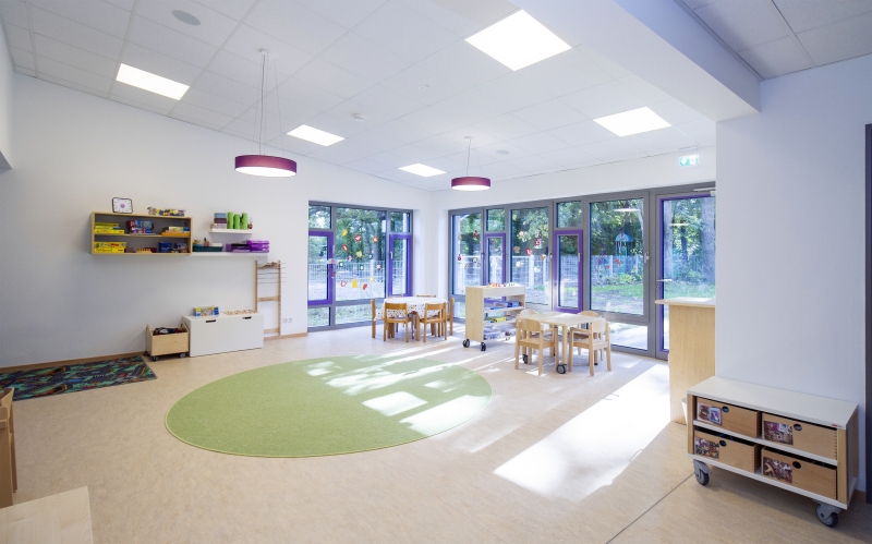 Eine Fassade aus sandfarbenem Verblender und Alu-Paneelen schafft Zugehörigkeit zum bestehenden Gebäude. Also alles in Einheit, aber ist durch die Baumaßnahme mehr hinzugekommen als zusätzliche Fläche? Die Antwort lautet schlicht: ja. Denn die Erweiterung auf nun fünf Gruppen schließt die Schaffung einer integrativen Gruppe ein. Und was passt letztlich besser in ein Konzept, das auf Farben und Vielfalt setzt?