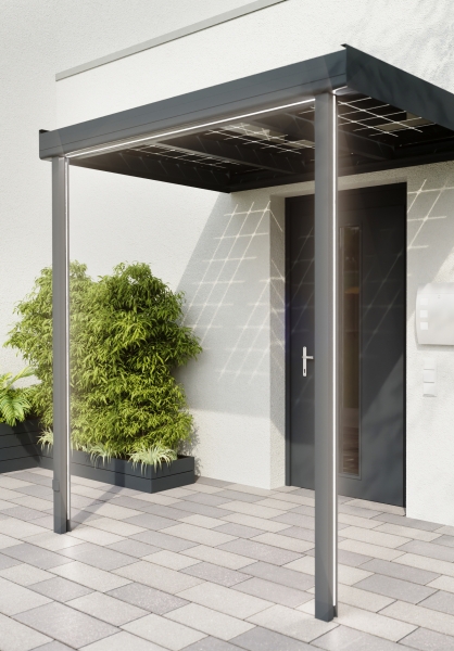 Einen – buchstäblich – guten Zugang zum Thema Solarstrom gewährt bspw. das neue Solarvordach. Denn neben seiner Schutzfunktion vor Regen & Co. erzeugt das Vordach mittels integriertem Premium Solarglas „Made in Germany“ umweltfreundlichen Strom direkt über der Haustür. Dabei sind die auf beiden Dachseiten aktiven Duplex-Module derart leistungsstark, dass sie auch bei Bewölkung effektiv Energie gewinnen – die den Bewohnern direkt als Hausstrom zur Verfügung steht. Das Tolle: Die Montage gelingt dank verständlichem DIY-Bausatz in wenigen Stunden; zudem wertet die optionale LED-Beleuchtung den Eingangsbereich stilvoll auf. Und: Neben ihrer Funktion als Vordach lässt sich die clevere Lösung auch als Raucherzone, Fahrradunterstand oder Lagerplatz für Kaminholz einsetzen.