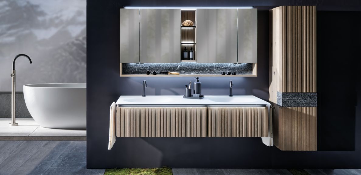 Diesen Frischekick gibt es jetzt auch für zu Hause – und zwar in Form von alpin inspirierten Naturholzmöbeln von Voglauer, die mit viel Liebe zum Detail gefertigt werden. Vlineos heißt die neue Möbelserie, die frischen Wind ins Bad bringt! Die gelungene Kombination aus massiver, rustikaler Altholz-Eiche – wahlweise Alteiche Rustiko oder Alteiche Rustiko Schwemmgrau – und schroffem, archaisch anmutendem Alpengranit bereichert das moderne Ambiente und macht die heilsame Naturatmosphäre der Wälder und Berge erlebbar. Abgerundet wird das puristische, designstarke Gesamtbild durch Becken, deren Form an Flusskiesel erinnert – vom Wasser glatt geschliffen und sanft gerundet. Ein optischer und haptischer Genuss! Besonderes Highlight: die unregelmäßige vertikale Struktur im Massivholz, die von Almstadl-Fassaden inspiriert ist. Natürlich punktet die charmante Möbelserie auch funktional. So überzeugen die Hängeschränke mit einer cleveren Aufteilung, die ausreichend Stauraum bietet. Praktisch: Die Kosmetikablage ist herausnehmbar! Vlineos wird im Einklang mit Mensch und Natur nachhaltig produziert und bringt Eleganz und Wohlbefinden ins Bad.