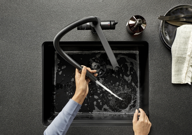 Die bestens aufeinander abgestimmte Systemlösung ist ein maßgeblicher Eckpfeiler für alle Planungsüberlegungen, da sie den Wasserplatz mit kurzen Laufwegen optimiert. Für das „Mehr“ an Genuss sorgt eine clevere Wasseraufbereitungseinheit, die Leitungswasser zu Trinkwasser veredelt. Mit unterschiedlichen Filtern lässt sich ganz individuell auf die Bedürfnisse des Haushalts eingehen. Die Wasseraufbereitungseinheit ist geschickt im Spülenunterschrank postiert, einem Raumwunder, das ebenso als Abfall- und Organisationselement dient.