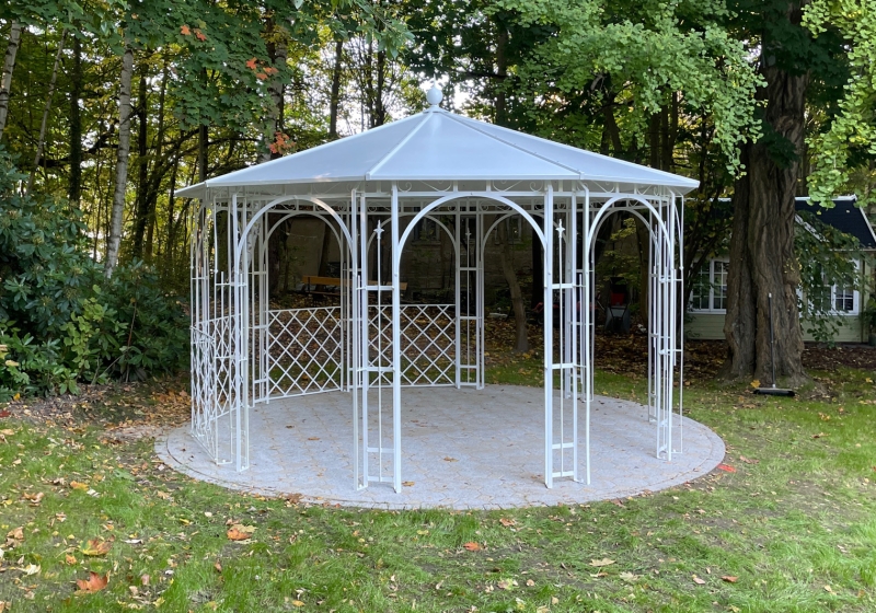 In kunstvoller Handarbeit werden wahlweise offene oder geschlossene Metall-Pavillons im baden-württembergischem Fichtenberg hergestellt. Geschwungene Linien, romantische Ornamente, geometrische Formen und bunte Fenster bringen „die gute alte Zeit“ – inspiriert von Jugendstil und mediterranem Lebensgefühl – in jeden Garten und laden zu erholsamen Auszeiten im Grünen mit dem gewissen Etwas ein. Wenn Kletterrose und Clematis filigran Richtung Himmel wachsen, entsteht z. B. mit einem Rank-Pavillon wie dem Modell Toskana ein Wohlfühlort im Schoße der Natur. Verspielt, lauschig und majestätisch präsentieren sich geschlossene Pavillon-Modelle mit edlen Gläsern. Hier lässt sich ganz originell und bestens geschützt vor Wind und Wetter die nachmittägliche „Teatime“ genießen. Garten & Design arbeitet in der eigenen Manufaktur mit hochwertigem und mundgeblasenem Glas sowie feuerverzinktem und wahlweise pulverbeschichtetem Metall. Sechs, acht oder zehn Ecken, Kugel oder Dachspitze, mit oder ohne wasserfeste Vorhänge: Neben vorgefertigten Modellen, die durch das Baukastenprinzip vielseitig gestaltet und ergänzt werden können, sind auch Sonderanfertigungen möglich, die nach individuellem Wunsch geplant und in allen deutschsprachigen Ländern geliefert und montiert werden.