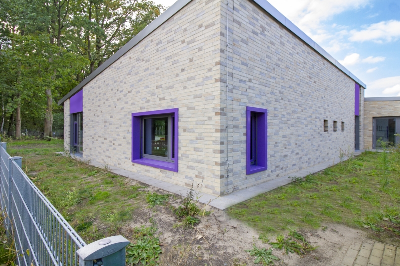 Eine Fassade aus sandfarbenem Verblender und Alu-Paneelen schafft Zugehörigkeit zum bestehenden Gebäude. Also alles in Einheit, aber ist durch die Baumaßnahme mehr hinzugekommen als zusätzliche Fläche? Die Antwort lautet schlicht: ja. Denn die Erweiterung auf nun fünf Gruppen schließt die Schaffung einer integrativen Gruppe ein. Und was passt letztlich besser in ein Konzept, das auf Farben und Vielfalt setzt?