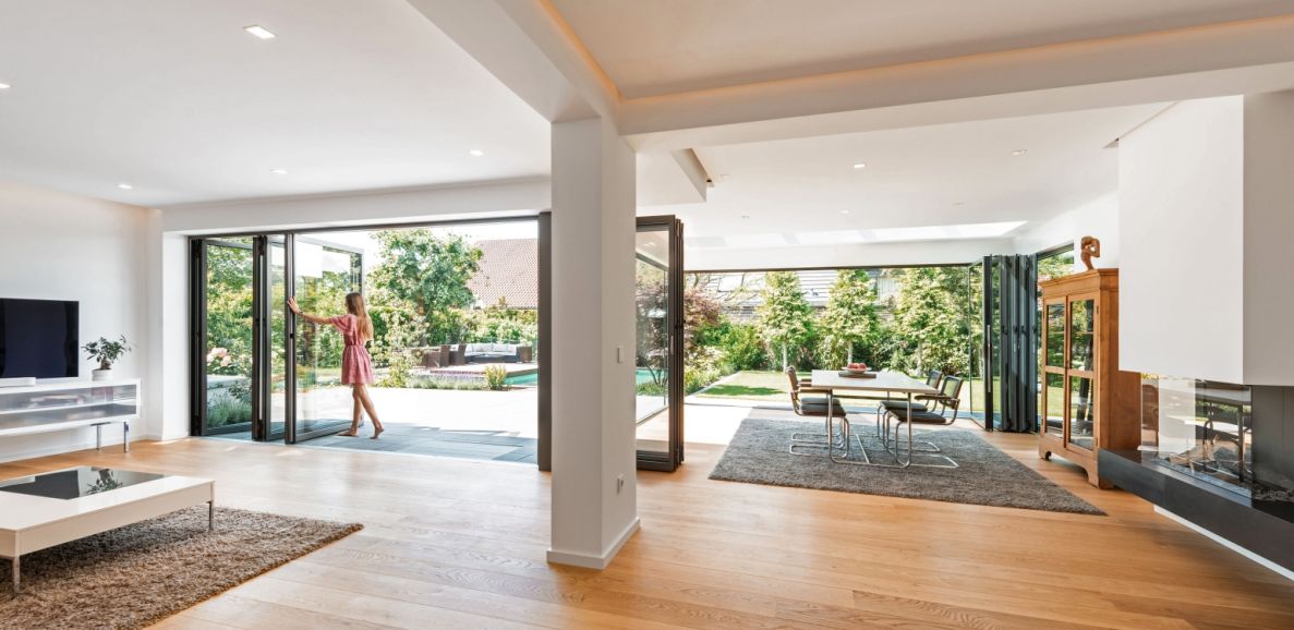 Von vorn betrachtet handelt es sich bei dem Einfamilienhaus in einem angesagten Wohnviertel im Großraum Münster um einen typischen, renovierten Bau aus den 1960er-Jahren. Das eigentliche Highlight verbirgt sich, von der Straße aus nicht einsehbar, auf der Rückseite: Drei neue Glas-Faltwände holen jede Menge Tageslicht und Frischluft in den Wohn-Essbereich und bieten einen herrlichen Ausblick auf den gepflegten Garten mit Terrasse und Pool. Gut sechs Monate Baustelle nahmen die Eigentümer dafür in Kauf. Architekt Franz Brüning vom Büro Brüning+Hart in Münster erinnert sich an das Projekt: "Ursprünglich sollte nur der alte Anbau entfernt und durch einen neuen und vor allem größeren ersetzt werden. Doch die Bauherrschaft hatte unheimlich viel Spaß daran, gemeinsam mit uns Ideen zu entwickeln und aufzugreifen." So entstand der Gedanke, gleich die ganze Wohnzimmerfassade, sogar über Eck, zum Garten hin zu öffnen, eine Zwischenwand zu entfernen und das Wohn- und Esszimmer um eine zweite Decke mit einem intelligenten Licht- und Soundsystem zu ergänzen. Die Pläne bereiteten den Architekten im Hinblick auf die Statik anfangs etwas Kopfzerbrechen. Mithilfe dreier großer Glas-Faltwände des Herstellers Solarlux konnten die Ideen jedoch in die Tat umgesetzt werden. Damit hat sich die vormals eher geschlossene Fassade in ein mediterranes Panorama verwandelt.